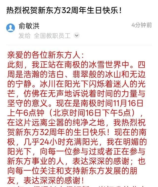 近日,新东方迎来32周年,创始人俞敏洪身处南极向全体员工发出一封全员信。信中提到,“此刻,我正站在南极的冰雪世界中…… 在这片远离尘嚣的纯净之地,我热烈祝贺新东方32周年的生日快乐。”不过,“老板看真企鹅,员工当工位牛马”成了不少网友在看到全员信后的第一反应,强烈反差让人难以“共情”。