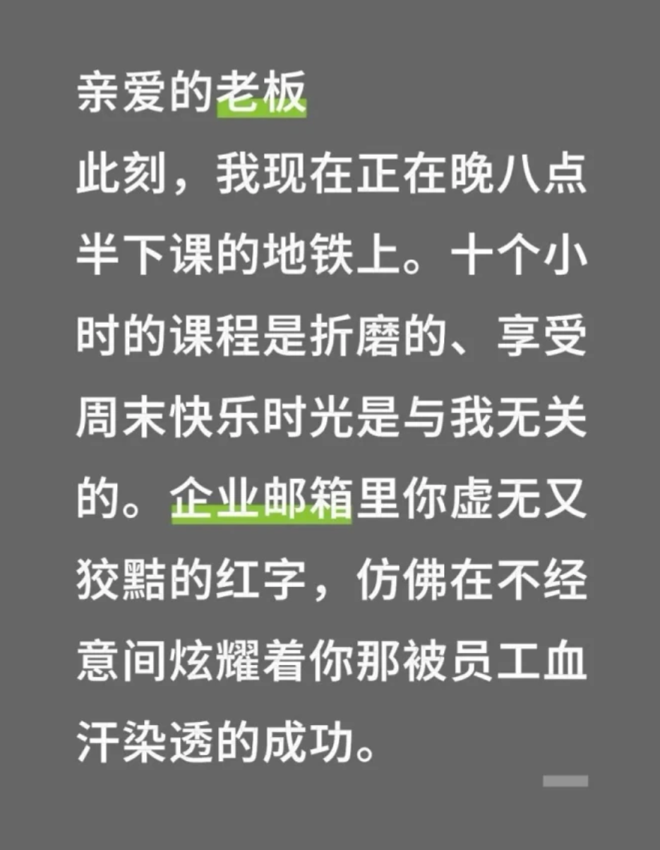 总而言之,舆论场讨论这封全员信的价值并不在于将其概括为简单的道德评判,更多在于借此审视企业内部沟通的有效性以及领导者角色认知调适。随着代际更替,企业组织内部出现对工作意义的多样化理解:有的人仍将工作视为自我成就乃至改变命运的主要途径,希望企业提供成长空间和长期发展路径;也有不少人更强调工作与生活的分界,希望以相对稳定与清晰的任务边界来换取生活中的自由度和掌控感;还有一部分人对所谓“愿景”“使命”本能持审慎态度,更愿意先看到看得见、摸得着的回报和保障,再谈认同感与归属感。在这样的背景下,企业的激励叙事如果持续依赖创始人个人奋斗史或者企业早期困境的回顾,容易在新一代员工那里失去说服力。后续能否通过更企业管理制度调整与持续沟通来转化舆论焦点,才是化解网络争议的关键。